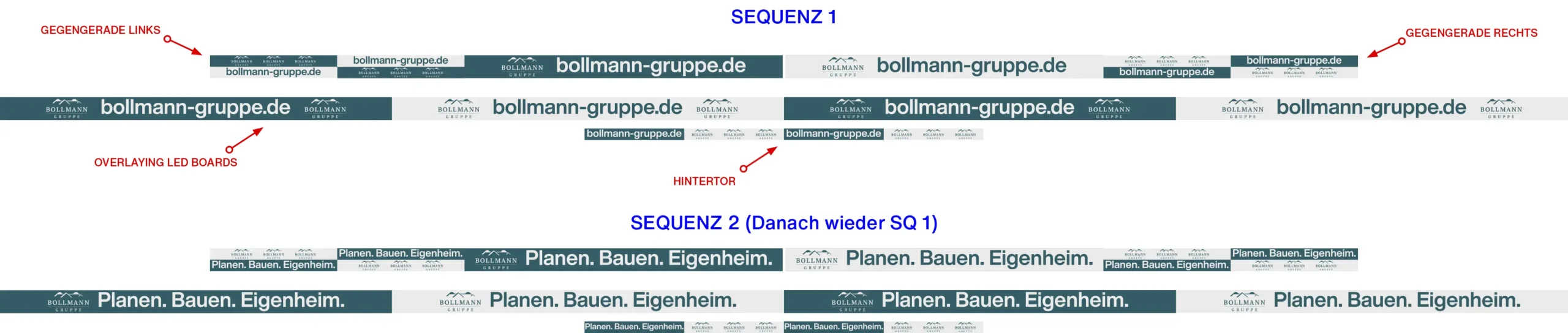 Zu Beginn habe ich die technischen Vorgaben der DFL und die Spezifikationen des Power-Pack-LED-Systems ausgewertet. Darauf basierend entstand ein klares Gestaltungssystem mit zwei Sequenzen: einer Variante mit Webadresse und einer mit Leistungsclaim. Die Gestaltung folgt den Hausfarben der Bollmann Gruppe, setzt auf hohe Lesbarkeit aus der Hauptkameraposition und vermeidet jede unzulässige Gegenbewegung.
