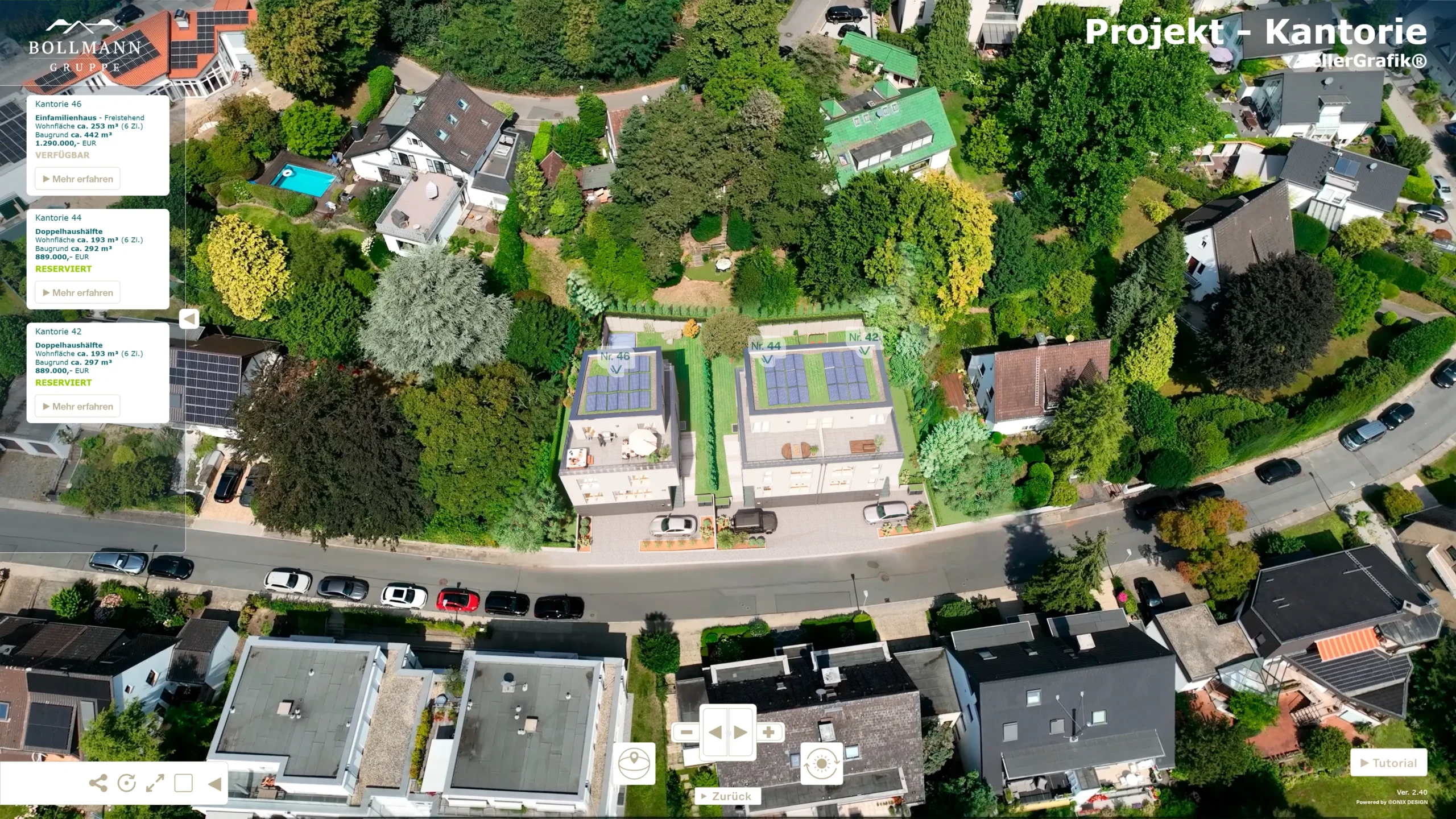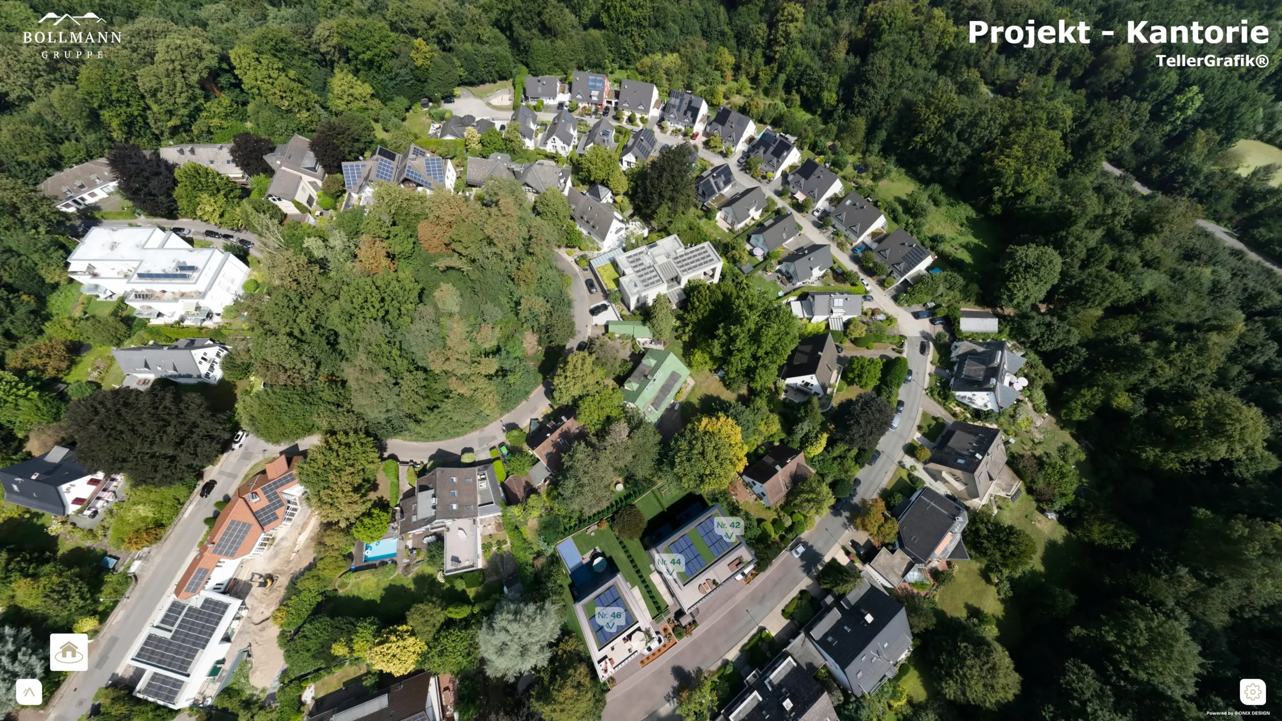 Die TellerGrafik® integriert Projekt- und Gebäudenavigation, Sonnenverlauf, Wohnungs– und Grundrissübersicht, Mikro–Lageanalyse, Infrastrukturvisualisierung, Verkaufsstatus sowie virtuelle Rundgänge – und verbindet diese Funktionen mit hochwertiger 3D-Visualisierung und realen Luftaufnahmen zu einem zentralen Vermarktungstool.