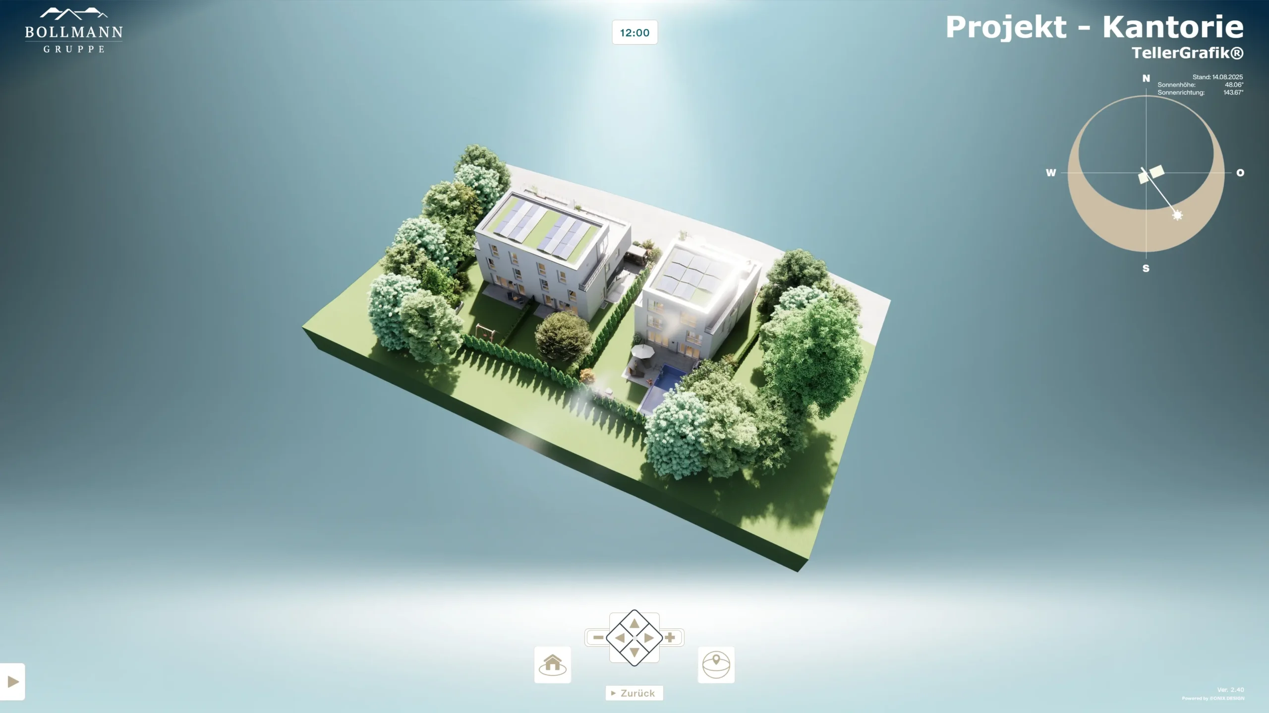 Reduzierte Außenansicht als schwenkbare, interaktive Sonnenverlauf-Animation für das gesamte Bauprojekt, optimiert für Desktop, Tablet und Smartphone.