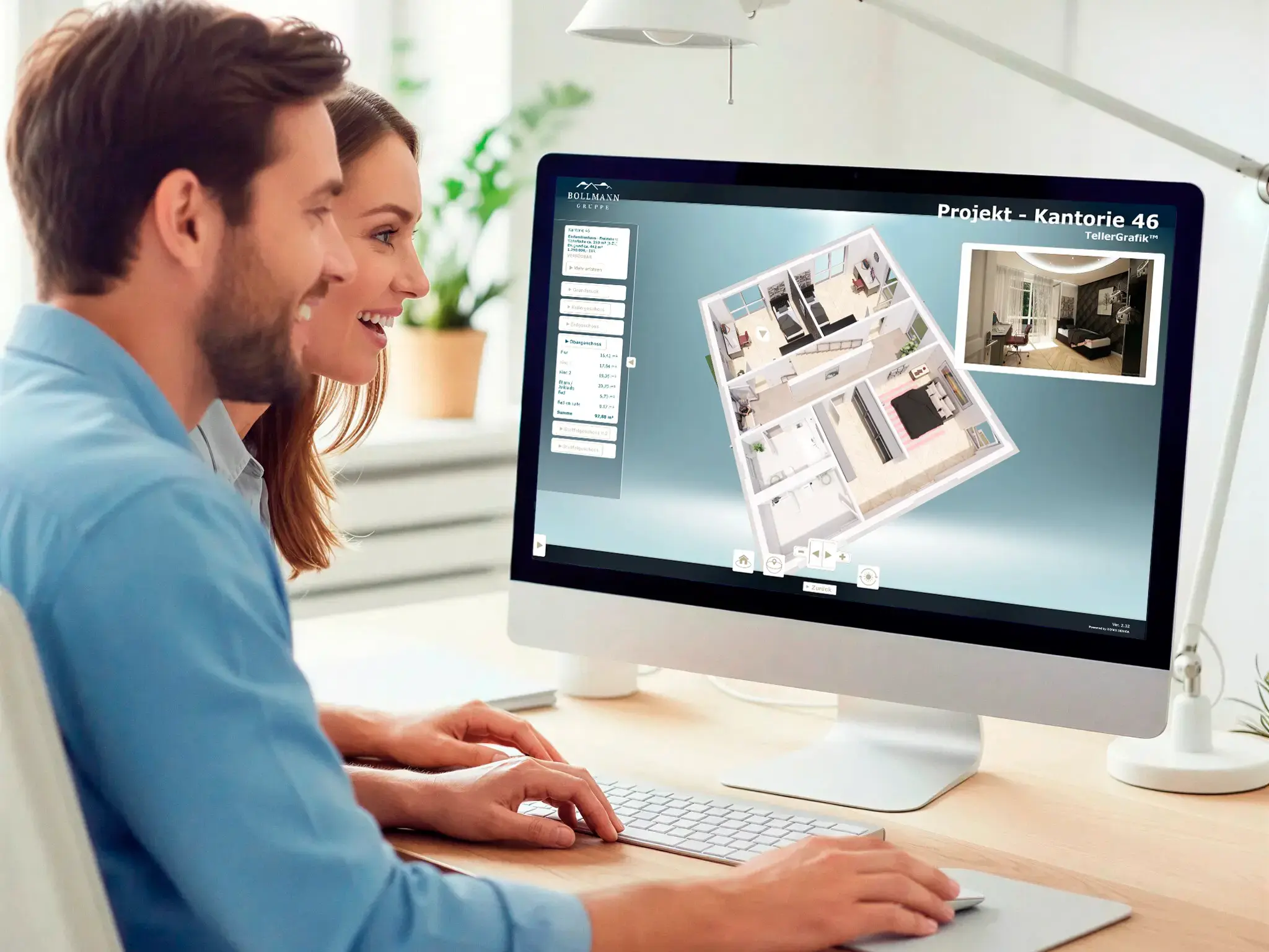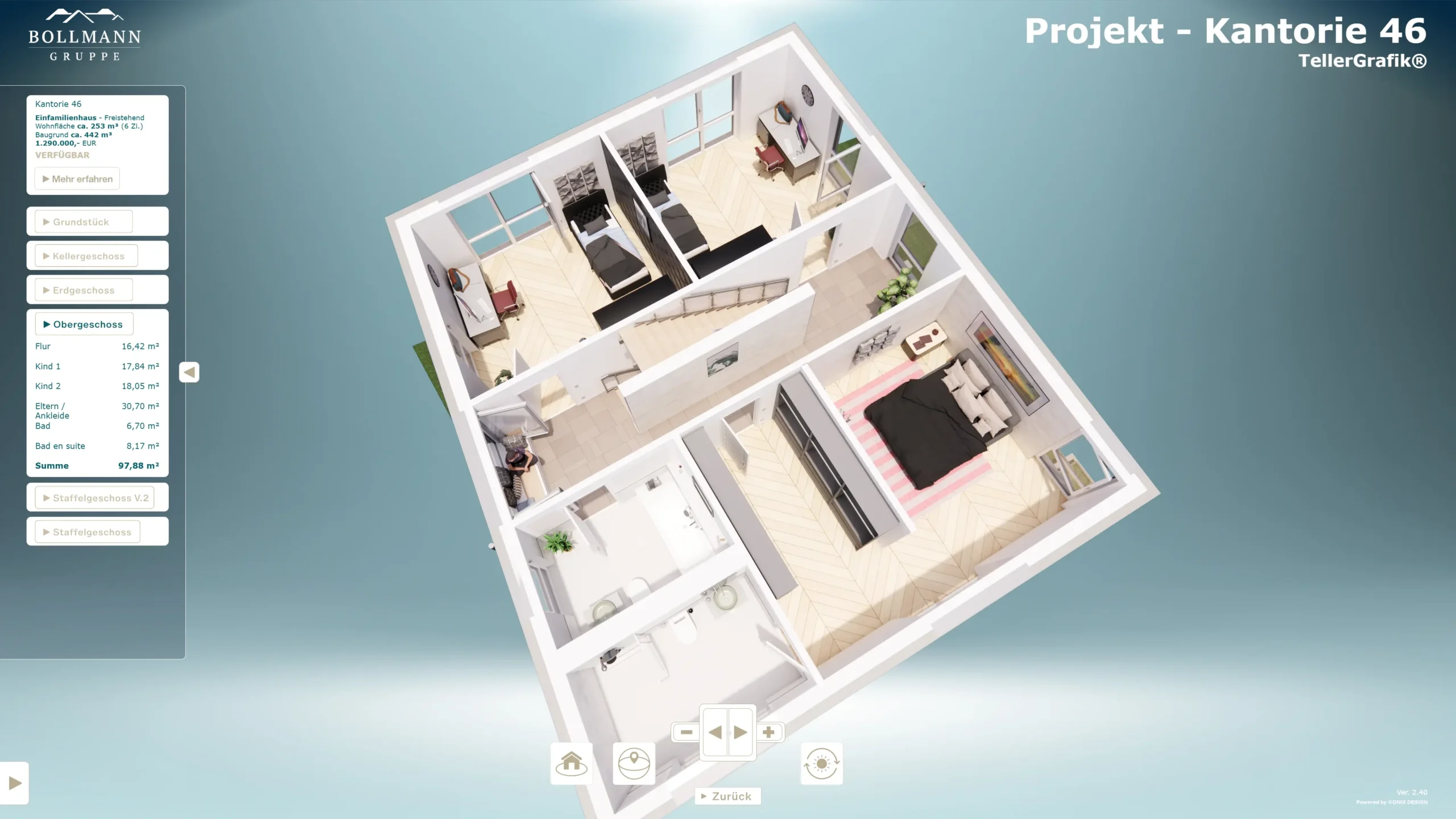 Interaktives Zusatzmodul mit schwenk- und zoombaren 3D-Grundrissansichten aller Geschosse und dem Gebäude auf Basis von Architekturvisualisierung bzw. Plan-/BIM-Daten. Räume, Einheiten und Bereiche sind anwählbar und werden zur besseren Orientierung hervorgehoben.