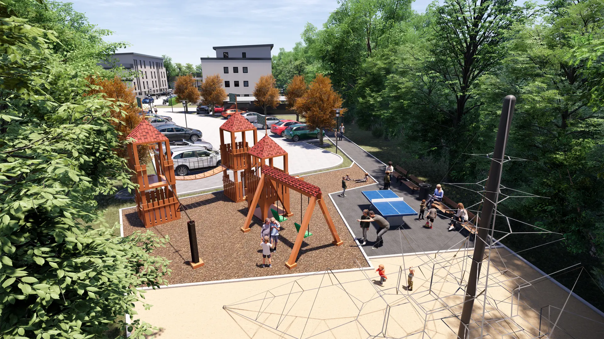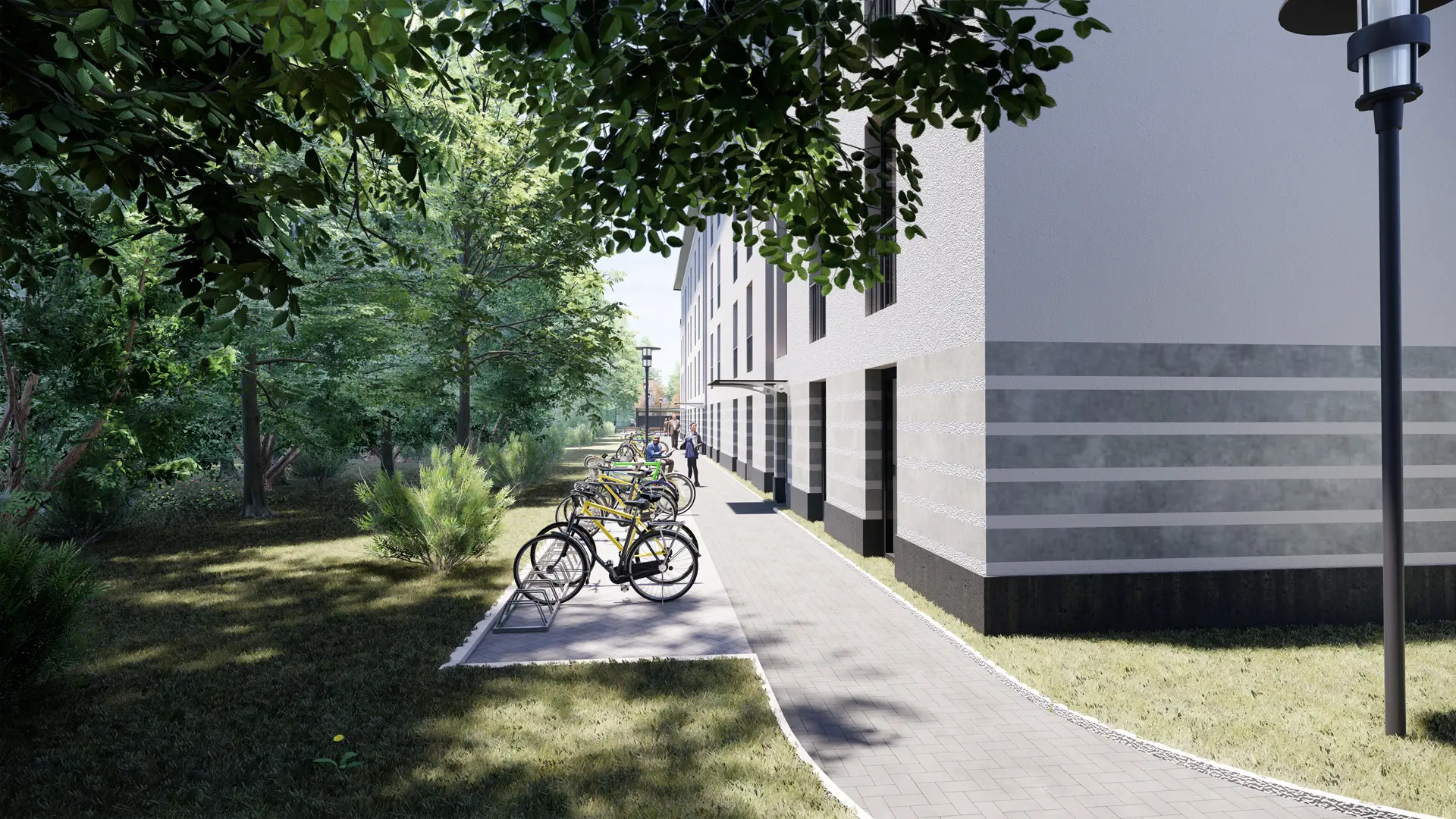 Zunächst habe ich auf Basis der Planungsunterlagen ein präzises 3D-Modell der Gebäude und Außenanlagen aufgebaut. Anschließend wurden Kameraperspektiven entwickelt, die sowohl das Gesamtareal als auch einzelne Baukörper übersichtlich zeigen. So entstanden Motive, die sich für Übersichten, Teaser und Detaildarstellungen gleichermaßen eignen.