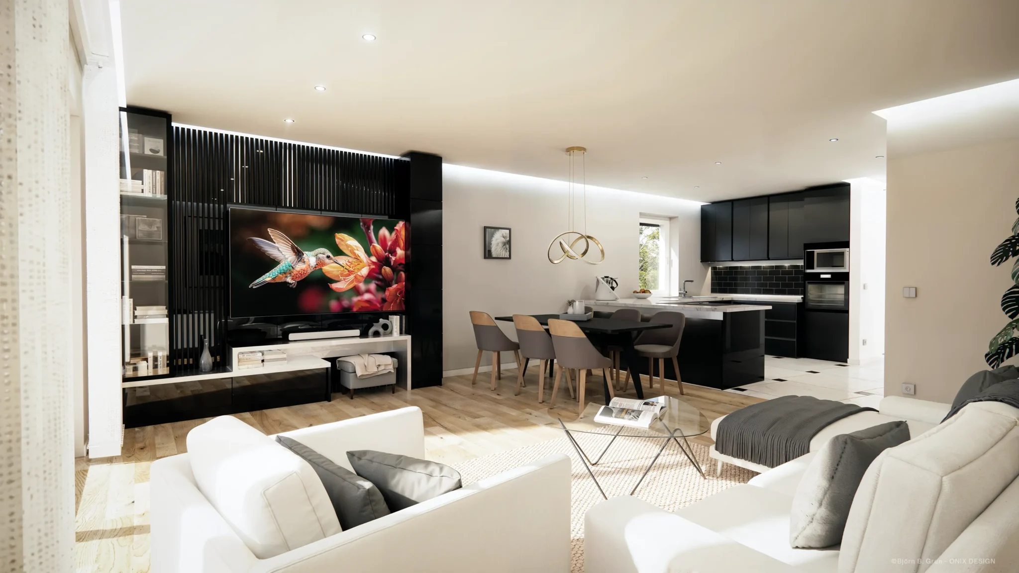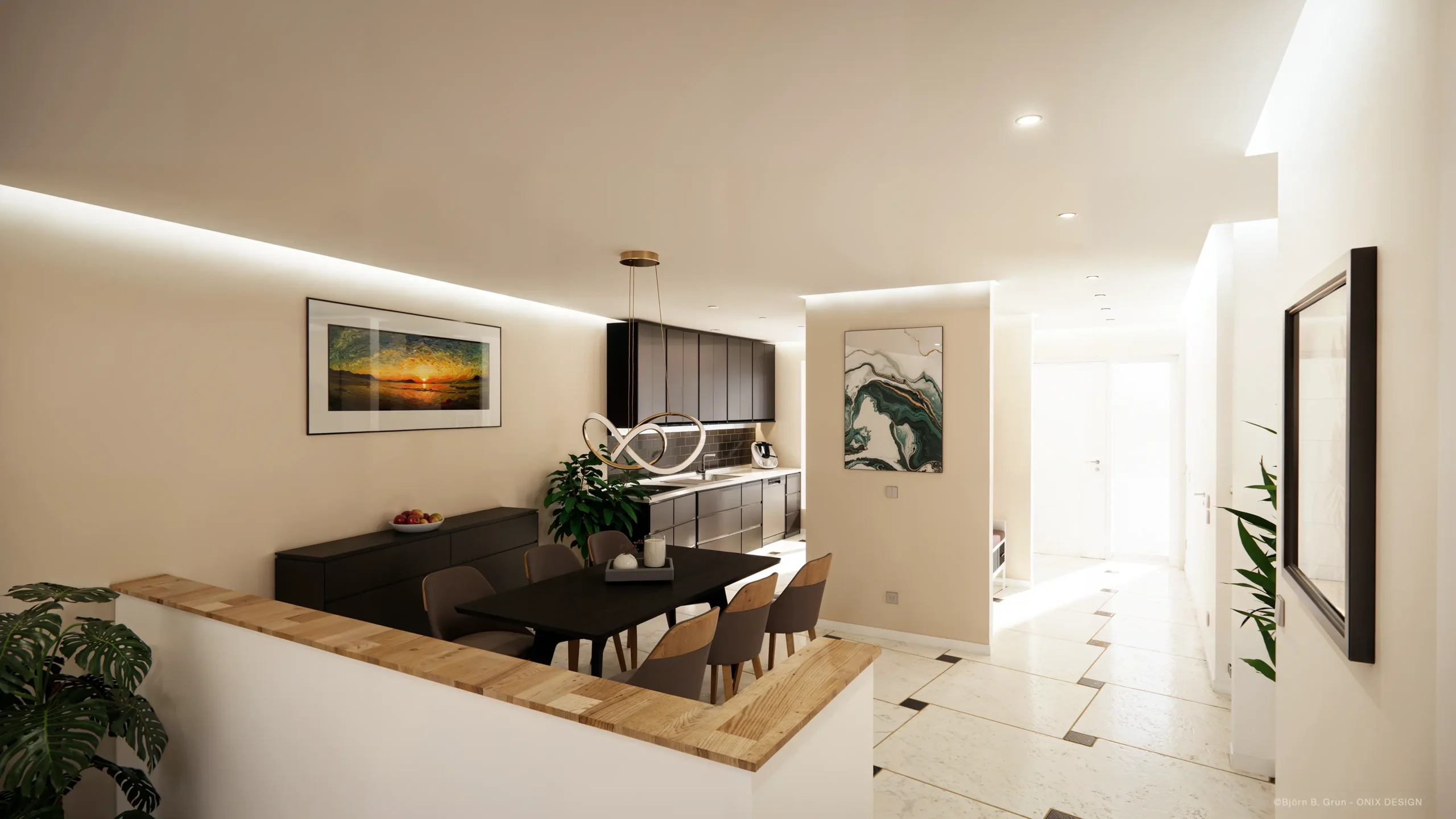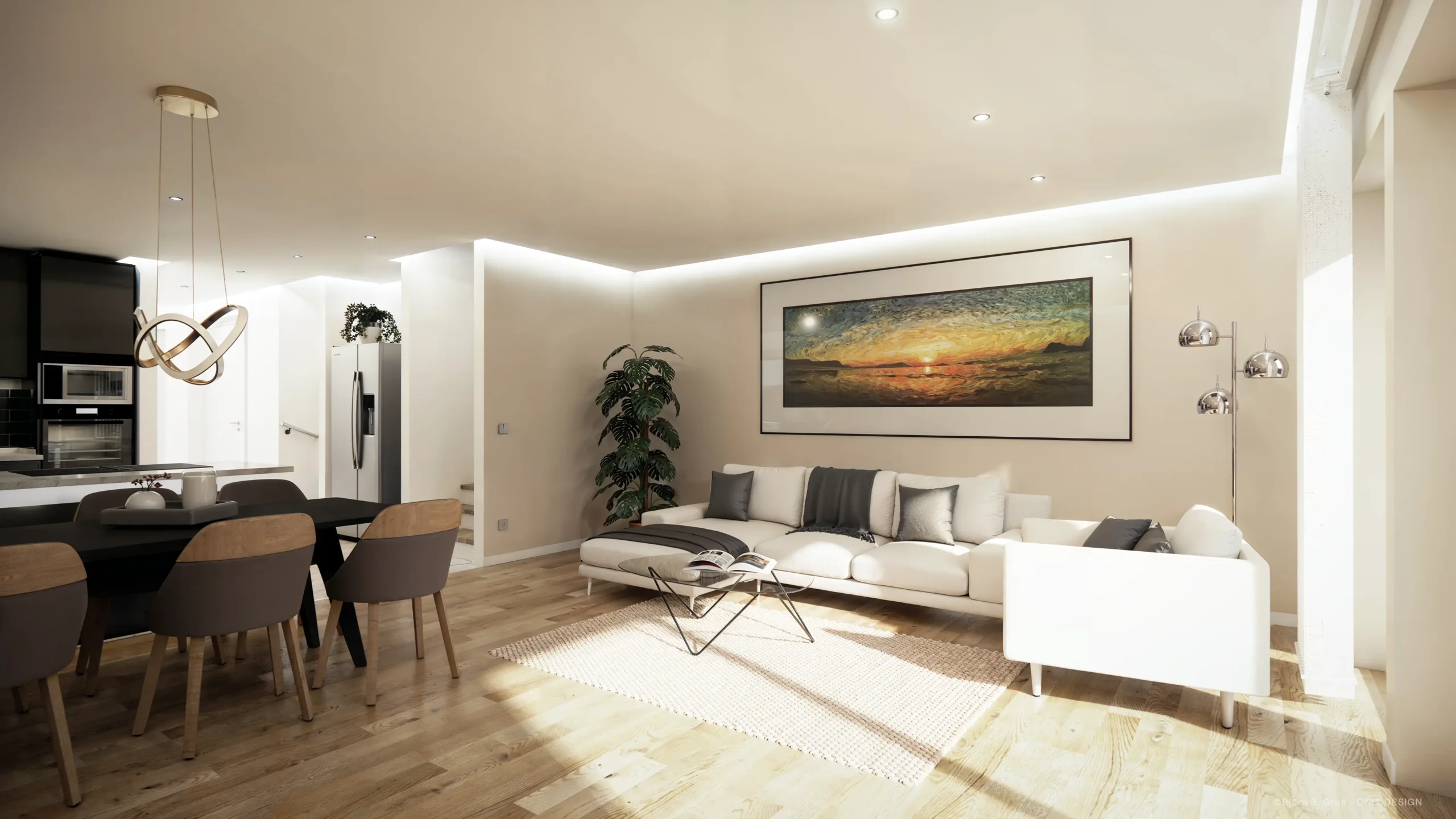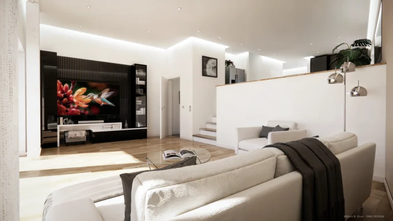 Zunächst habe ich die vorhandenen Unterlagen, Grundrisse und Außenvisualisierungen analysiert. Daraus entstand ein klares Interior-Konzept, das Architektur, Lichtführung und Möblierung sinnvoll verbindet. Wichtig war, dass die neuen Innenbilder die Stärken der Häuser zeigen: großzügige Wohnbereiche, familienfreundliche Grundrisse und helle Räume mit Bezug zum Garten.