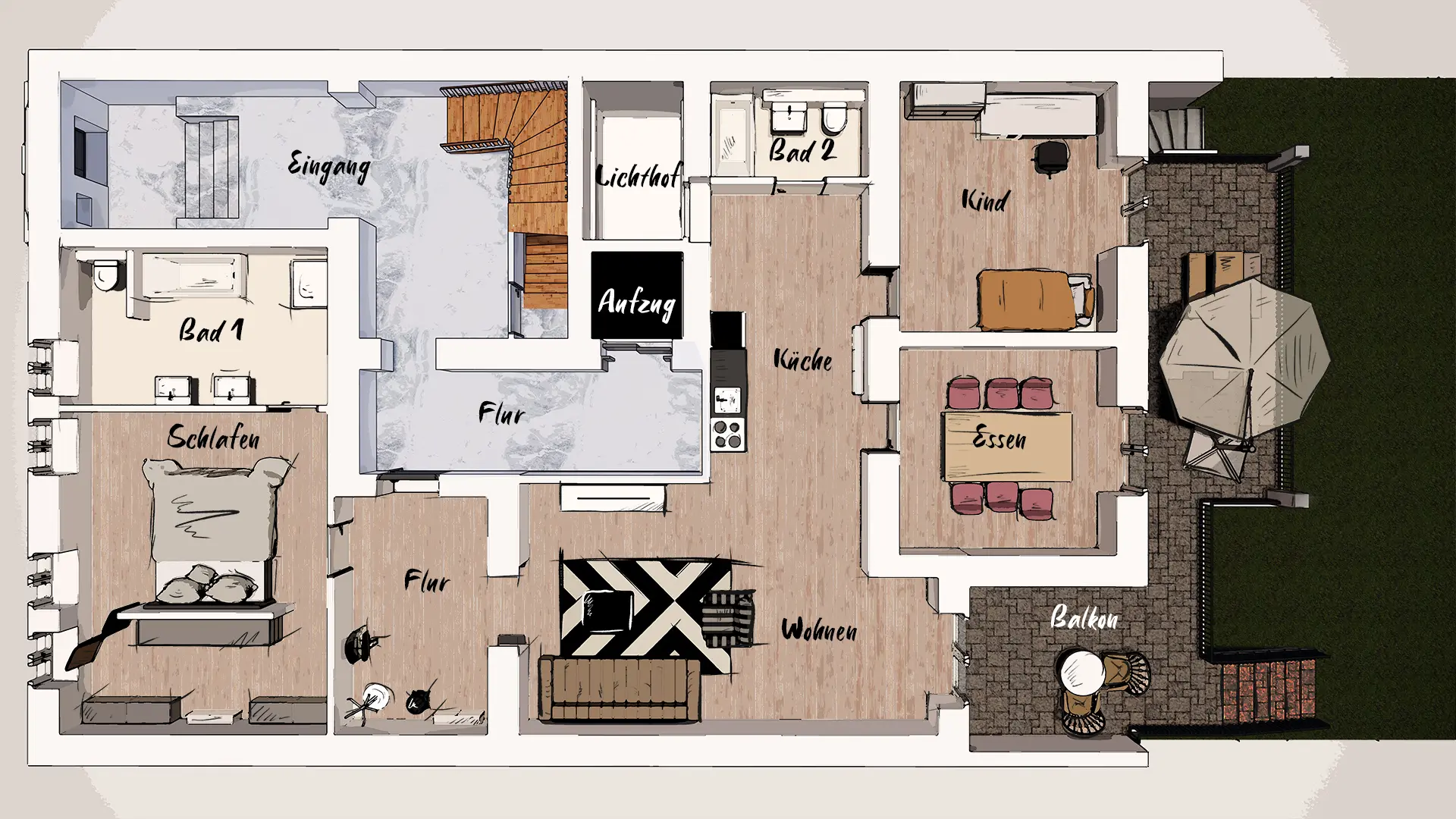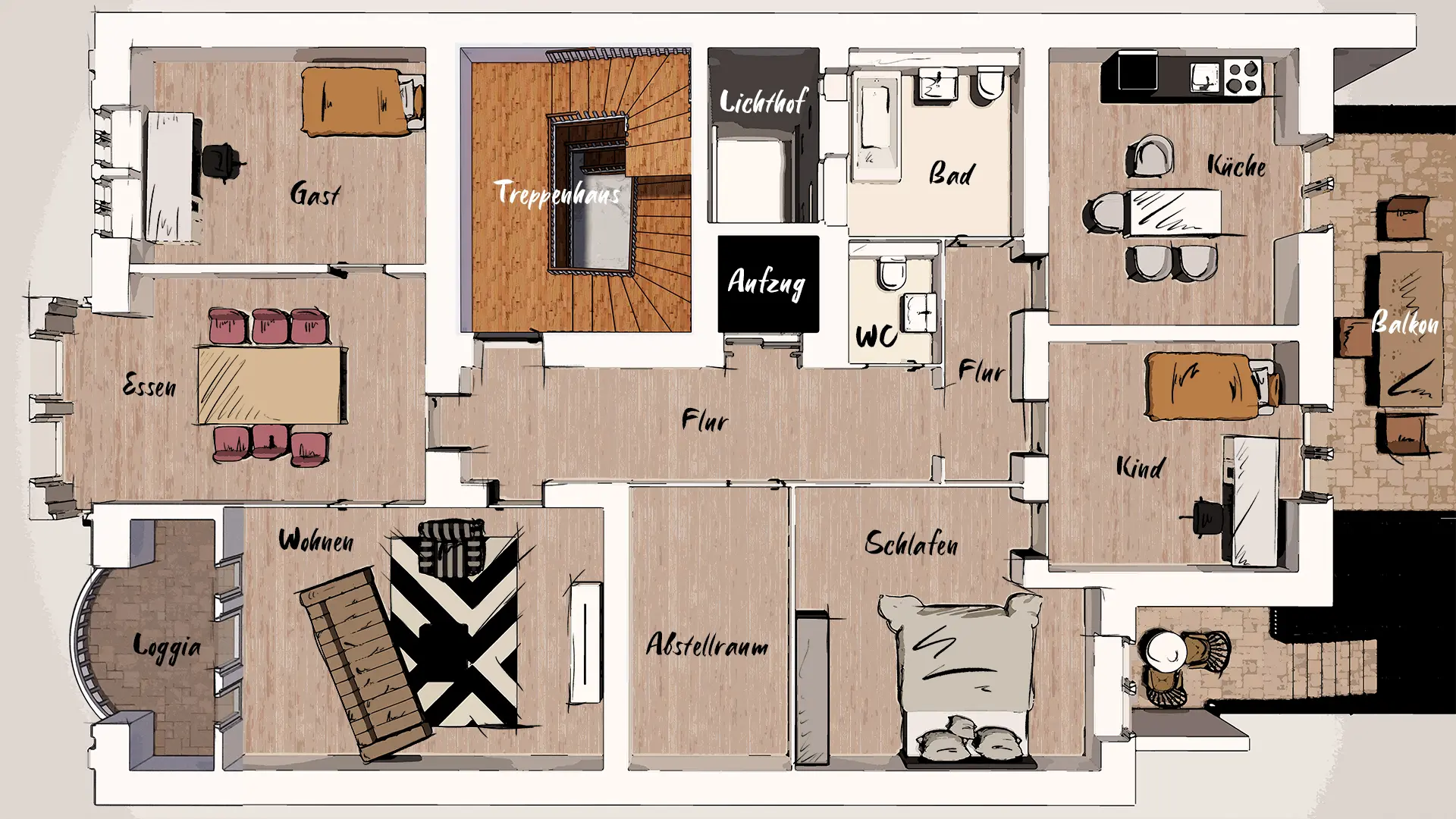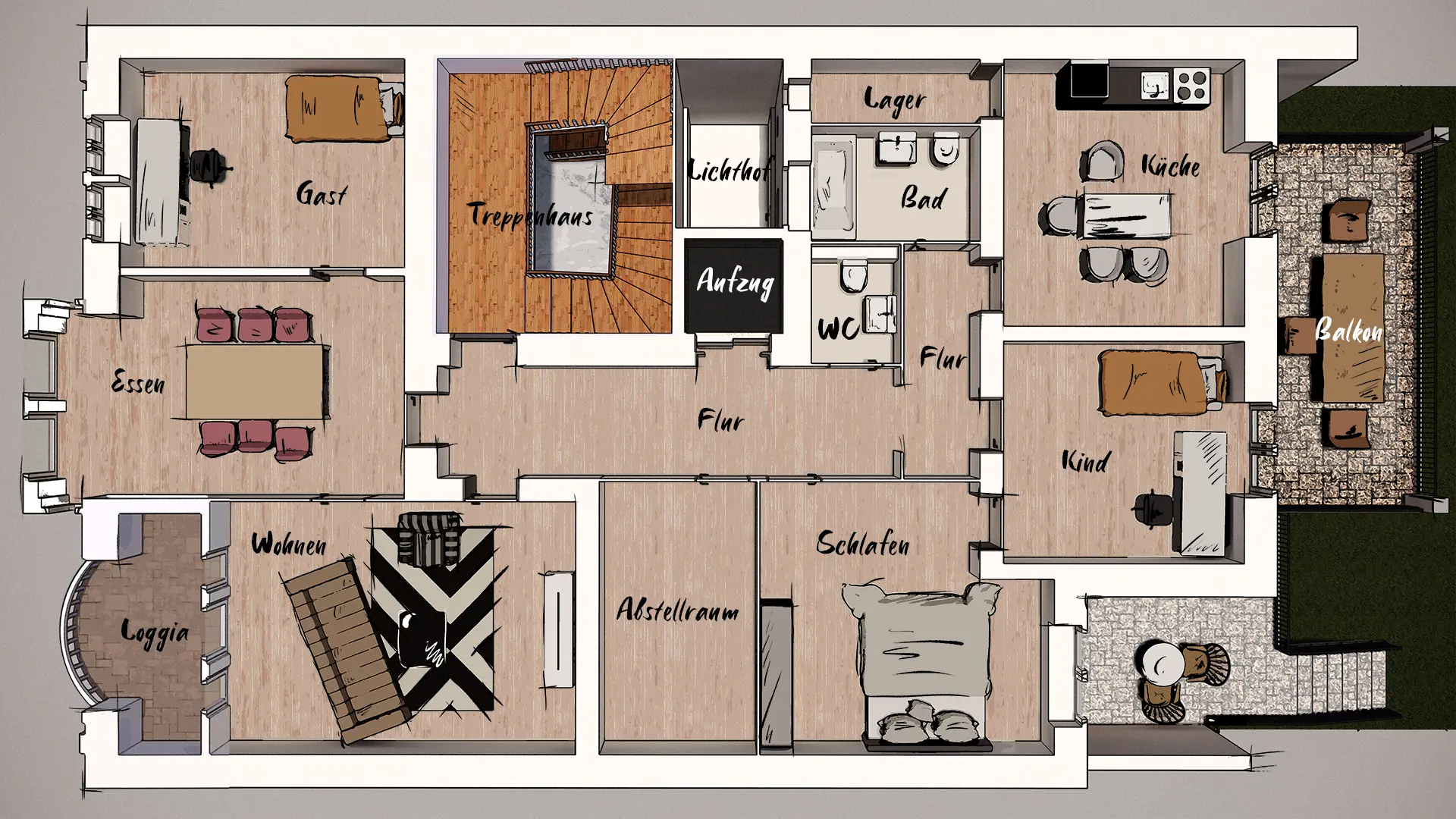 Möblierung, Raumbezeichnungen und Belichtungssituationen sind klar erkennbar.