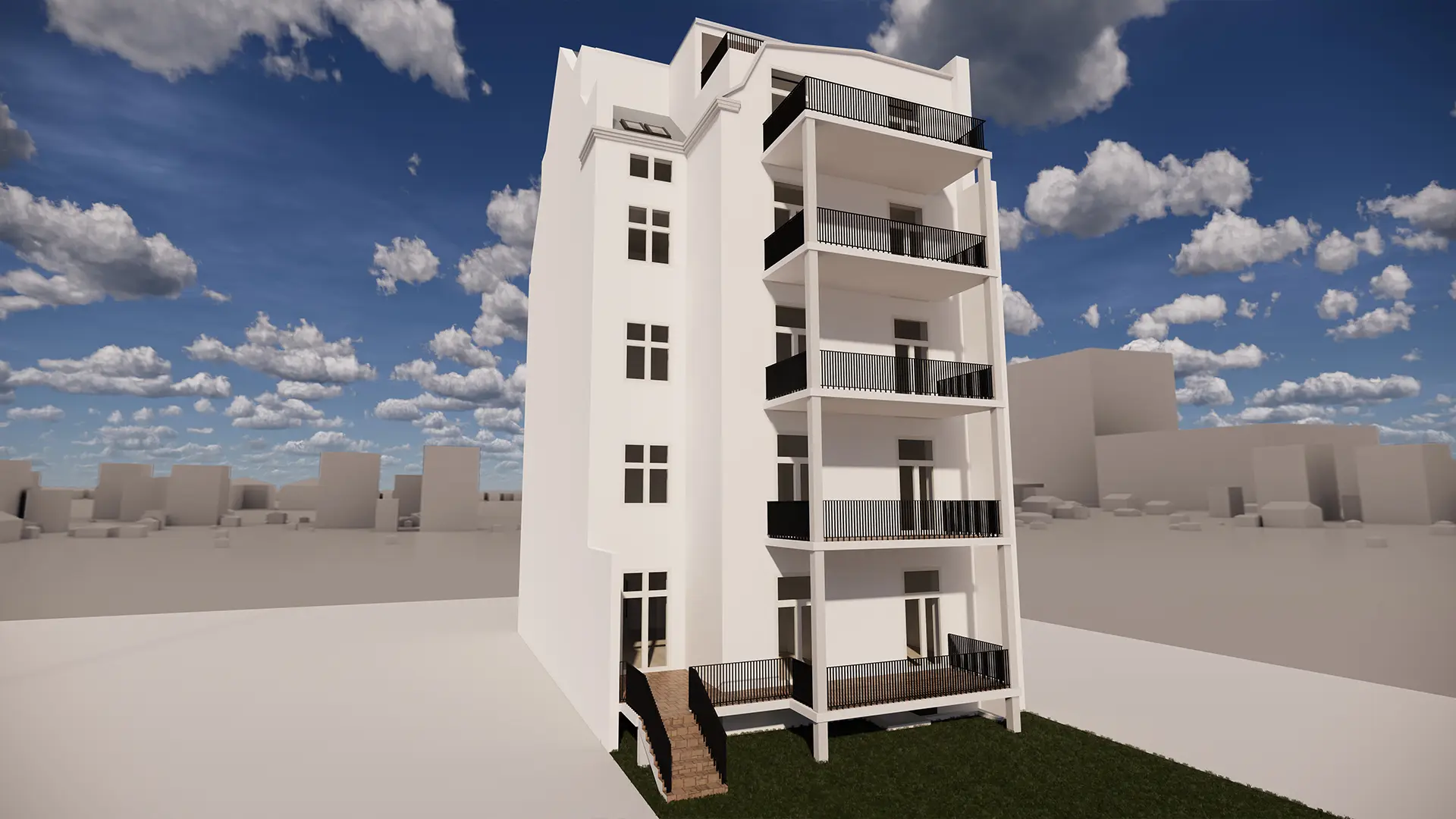 Ziel war es, das bestehende Mehrfamilienhaus mit geplanter Umgestaltung als klar lesbare Außenansicht zu zeigen und zugleich die neuen Grundrisslösungen darzustellen.