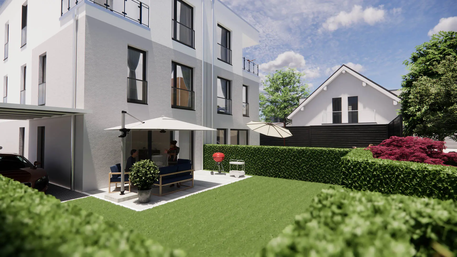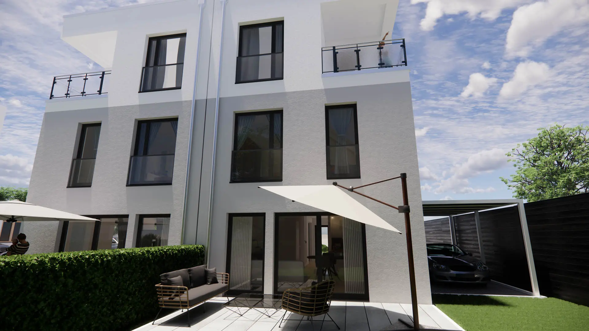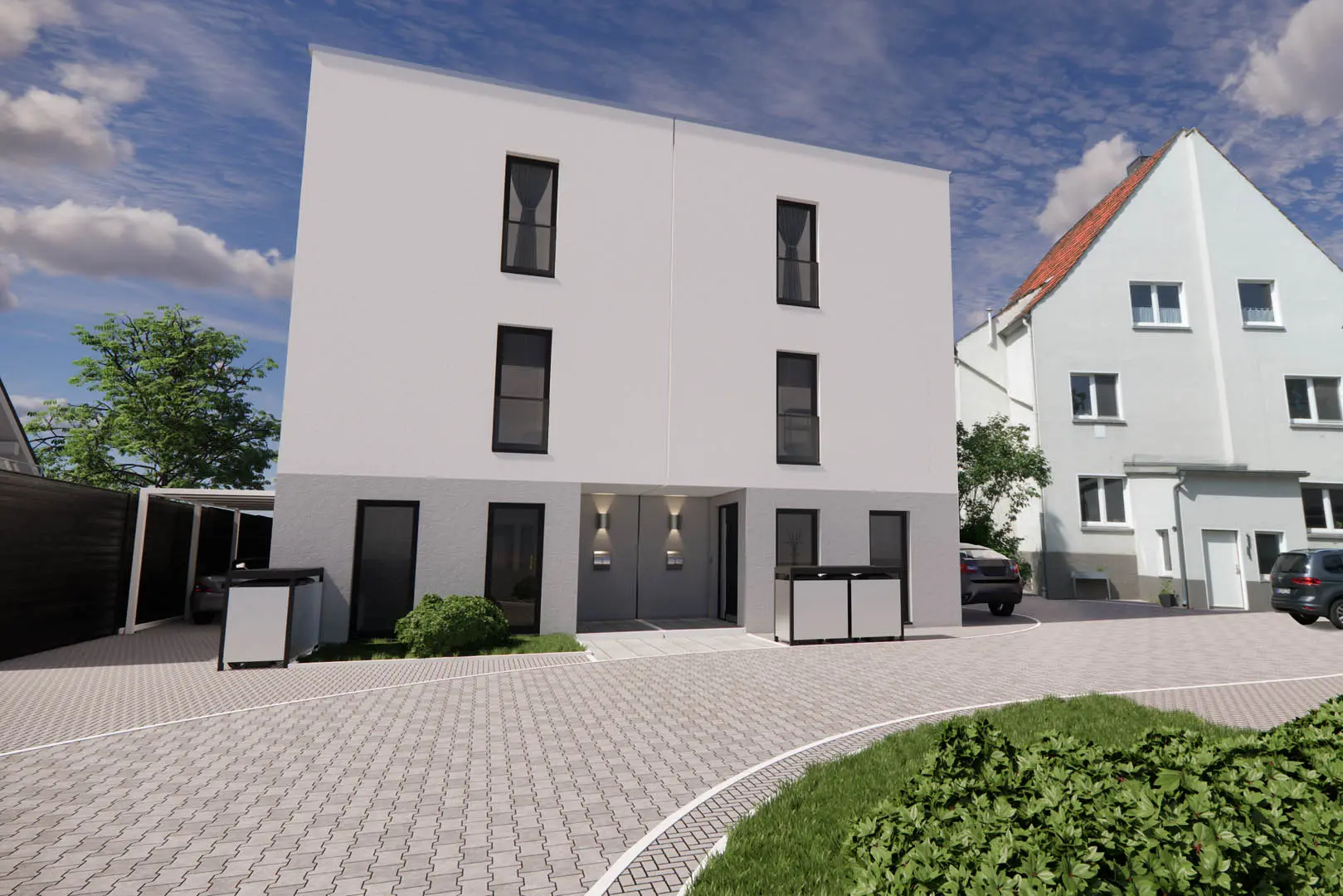Ziel war es, das Doppelhaus in der bestehenden Wohnumgebung klar zu zeigen und bereits vor Baubeginn ein realistisches Bild der Architektur und der Lage zu vermitteln. Neben klassischen Renderings sollten auch Hybridaufnahmen entstehen, also die Kombination aus 3D-Gebäude und echten Fotografie.